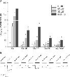 Fig. 2. IGABA modulation by VA-ester derivatives (A) Enhancement of IGABA through GABAA receptors composed of α1β3γ2S subunits by 1 µM (white bars), 10 µM (light grey bars), 30 μM (dark grey bars) and 100 μM (black bars) of the indicated compounds. Each value represents the mean±S.E.M from at least 5 oocytes and ≥2 oocyte batches. (*) indicates significantly different from IGABA enhancement by VA at the same concentration (P<0.05, Student׳s t-test) (B) Typical traces for the potentiation of chloride currents through α1β3γ2S channels by VA-derivatives at a GABA EC3–7. Control currents (GABA, single bar) and corresponding currents elicited by co-application of GABA and the indicated compound (double bar) are shown.