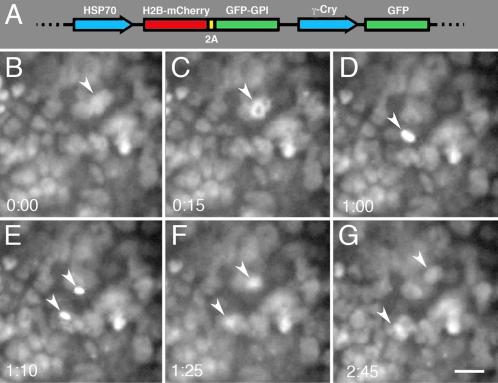 Figure 6. Micrographs of cell division in Xenopus corneaepithelium. A: The mG-HGEM transgenic construct carrying a heat-shock inducible histone H2B-mCherry protein. It also carries a membrane GFP protein separated by a 2A peptide sequence (GFP expression was not imaged in these experiments). As a screening tool the construct uses the lens-specific gamma-crystallin promoter to drive GFP expression. BâG: Imaging H2B-mCherry expression in a cornea epithelial cell going through mitosis (arrowheads). (B) Premitotic cell. (C) Prophase. (D) Metaphase. (E) Anaphase. (F) Telophase. (G) The resulting daughter cells. This particular division occurred over an unusually long distance. A movie of this division can be seen in Supp. Movie S2. Relative time is denoted in hours:minutes. Scale barâ=â20 μm in G.