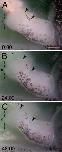 Figure 5. Time-lapse imaging of hindlimb development. AâC: Growth of a stage 53â54 lefthindlimb at 24 hr intervals over 48 hr. During this time melanophores can be seen migrating and expanding on the ventral edge of the left hind limb (arrowheads indicate the expanding range of these cells), in addition to vascularization and digit development in the digital plate. The shape of the marginal vein can be seen changing as digit 4 elongates (asterisk indicates the location of digit 4). A dashed line has been included as a reference mark for this elongation. This plate corresponds to Supp. Movie S1. Relative time is denoted in hours:minutes. Scale barâ=â250 μm in A.Download figure to PowerPoint