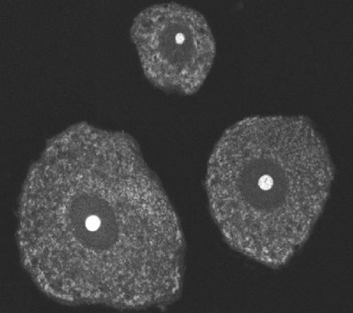 Figure 3. Cell growth and RNP size scaling. In this image, dorsal root ganglia neurons of different size are stained with propidium iodide to visualize a single large nucleolus (white spot) within each cell nucleus. The size of nuclei and nucleoli increases with cell size. Adapted from Berciano et al. (2007) with permission from Elsevier.