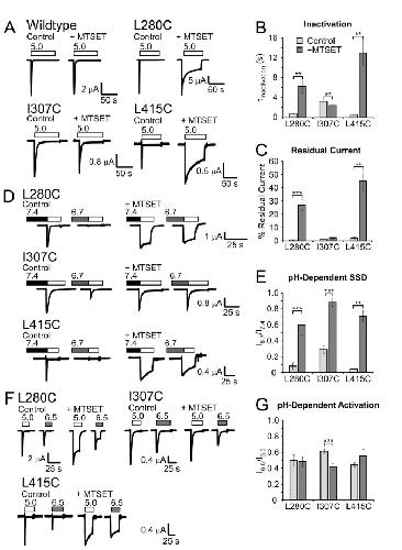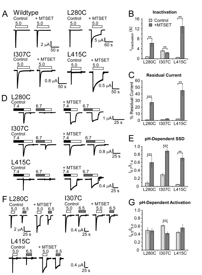 Figure 2. MTSET modification of L280C, I307C, and L415C.A. Effect of MTSET on wildtype or mutant ASIC1a expressed in Xenopus oocytes. MTSET (300 µM) was applied at pH 7.4 for 3 minutes and removed by washing with pH 7.4 solutions. pH 5.0-evoked currents after MTSET incubation (“+ MTSET”) were compared to control currents in the same oocyte measured before MTSET application (“Control”). B–C. Quantification of (B) tau of inactivation (n = 6-8) and (C) residual current (n = 6-7). D. Representative recordings of steady-state desensitization (SSD) before and after MTSET modification. Oocytes were maintained at a basal of pH 7.9 and then incubated with pH 6.7 for 2 minutes to induce SSD (shaded bars) prior to activation with pH 5.0 (white bars). E. Quantification of MTSET-dependent changes in SSD (n = 5-6). F. Representative traces of MTSET exposure on pH-dependent activation. MTSET was applied as above and the response to pH 5.0 (white bars) or pH 6.5 (gray bars) from basal pH 7.4 was measured. G. Quantification of pH 6.5-mediated activation before and after MTSET modification (n = 6-8). Data are mean ± SEM. “**” and “***” indicate p-values < 0.01 and 0.001, respectively. Significance was determined with paired Student’s t-tests. |
