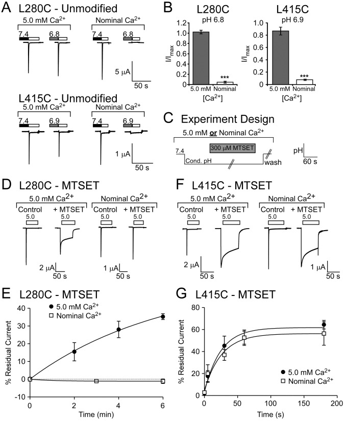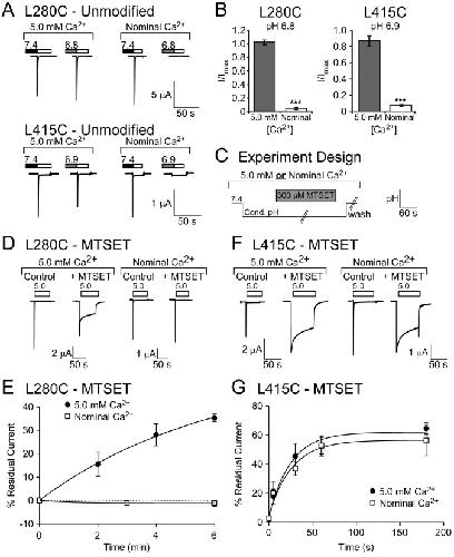 Figure 3. MTSET modification of desensitized L280C and L415C.A. Representative traces of calcium-dependent gating of unmodified L280C and L415C. Oocytes were exposed to the indicated pH (pH 6.8 for L280C or pH 6.9 for L415C) in either 5.0 mM Ca2+ or nominal Ca2+ -free solutions to foster ASIC1a transition to distinct gating states at the same pH. B. Quantification of calcium-dependent gating. The presence of 5.0 mM Ca2+ maintained L280C and L415C in the closed state when cells were treated with the conditioning pH (pH 6.8 for L280C or pH 6.9 for L415C) for ~2 minutes. This was evident by robust pH 5.0 evoked currents following conditioning with the mildly acidic pH (n = 6-8). Conditioning with the same pH in nominal Ca2+ induced steady-state desensitization of L280C and L415C (n = 6-8). C. Schematic of the experiment to assess accessibility. The closed state of ASIC1a was maintained by conditioning with pH 6.8 (L280) or 6.9 (L415) containing 5 mM Ca2+. The desensitized state was evoked by conditioning with the same pH in nominal calcium. 300 µM MTSET was applied in the conditioning pH for the indicated time and then excess MTSET was washed away with conditioning solution. Oocytes were then returned to pH 7.4 before activation with pH 5.0. D. Representative traces of L280C pH 5.0-evoked currents before (control) and after 6 minutes of MTSET incubation. E. Quantification of residual current of L280C after MTSET exposure for the indicated time (n = 4-6). F. Representative traces of L415C before (control) and after 60 second intervals of MTSET incubation. G. Quantification of residual current of L415C after MTSET exposure for the indicated time (n = 4-6). Curves represent one-phase association exponential fits of the data points. Data are mean ± SEM. “***” indicates p < 0.001 compared to 5.0 mM Ca2+ conditioning. |