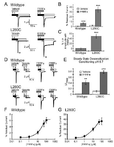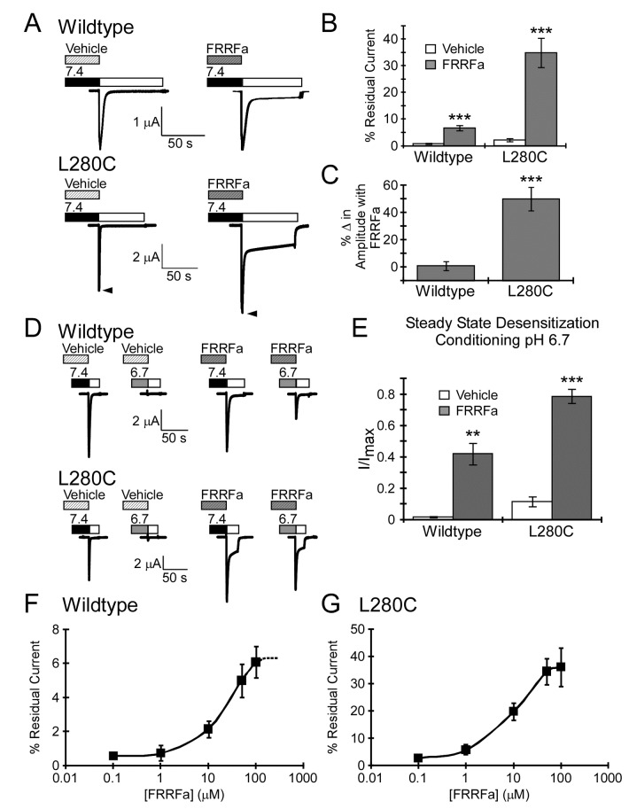 Figure 4. FRRFa modulation of L280C.A. FRRFa increases residual current of wildtype and L280C. FRRFa (100 µM) was applied for 1 minute at pH 7.4 prior to activation with pH 5.0. For L280C, arrowheads highlight the FRRFa-induced increase in peak current amplitude. B. Quantification of residual current (n = 14-17). C. Quantification of FRRFa modulation on pH 5.0-evoked peak current amplitude. The percent change in amplitude was determined by subtracting the pH 5.0-evoked peak current amplitude of vehicle from the pH 5.0 evoked peak current amplitude evoked after FRRFamide modulation and normalizing to the vehicle peak current amplitude from the same cell (n = 17-25). D. Representative trace of FRRFa modulation on steady-state desensitization. 100 µM FRRFa or vehicle was applied for 1 minute at basal pH 7.4 and again during the 2 minute incubation with conditioning pH 6.7. Proton-gated current was evoked with pH 5.0 (white bar). E. Quantification of FRRFa modulation of steady-state desensitization (n = 4). F–G. FRRFamide concentration response curve for wildtype ASIC1a (F) and L280C (G). The effect of FRRFamide on residual current was assessed. Our data suggest that 100 µM FRRFa induced a maximal response on wildtype ASIC1a as 300 µM FRRFa was not significantly different from 100 µM FRRFa (n = 5, p = 0.69 paired Student’s t-test, difference between 100µM and 300µM was 10.42% ± 11.25%; data not shown). Based on this information, the calculated EC50 for wildtype ASIC1a was 20 ± 4 µM and 14 ± 4 µM for L280C (n = 6-8, p = 0.34). Data are mean ± SEM. “**” and “***” indicates p-value < 0.01 and 0.001 respectively. |