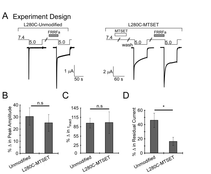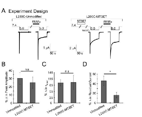 Figure 6. FRRFa modulates L280C after MTSET modification.A. Schematic of experimental design and representative traces. Left Panel: L280C was activated with pH 5.0 with and without 100 µM FRRFa. Right Panel: L280C was modified with 300 µM MTSET for 3 minutes at pH 7.4. After treatment, MTSET was removed by washing with pH 7.4 and pH 5.0-evoked current was recorded in the absence of FRRFamide. Channels were then washed with pH 7.4 and allowed to recover for 1 minute. Then pH 7.4 solutions containing 100 µM FRRFa were applied for 1 minute. After application of FRRFa, channels were activated with pH 5.0. For quantification (B–D), % change was determined by subtracting the stated characteristic (peak amplitude, residual current, or τinact) with FRRFa from control (no peptide) and normalized to the no peptide response. B. Quantification of % change in peak current amplitude. The magnitude of the change in peak current amplitude evoked with FRRFa was independent of MTSET modification (n = 8-11, p = 0.6). C. Quantification of the % change in the rate of inactivation (τinact). FRRFa response on inactivation after MTSET was not significantly different from FRRFa response on unmodified L280C (n = 8-11, p = 0.9). D. Quantification of % change in residual current. After MTSET modification, FRRFa still increased residual current (n = 8, p = 0.02, paired Student’s t-test), but this was not as robust as FRRFa-induced residual current of unmodified L280C (n = 8-11, p = 0.03). Data are mean ± SEM. “*” indicates p < 0.05 and n.s. indicates no significant difference. |