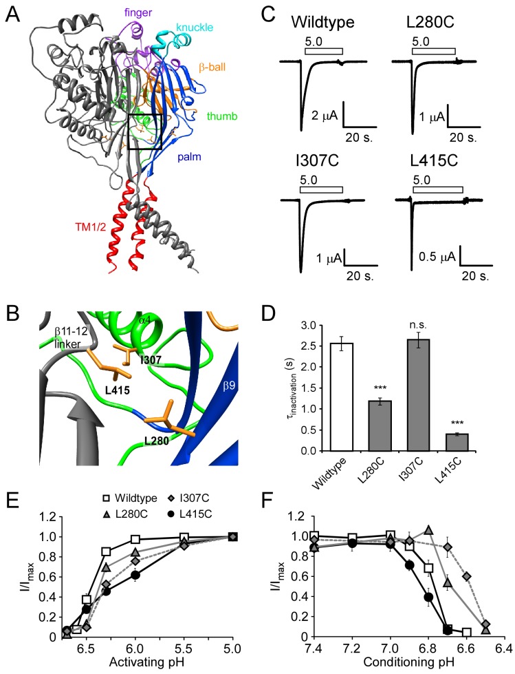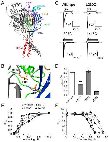 Figure 1. Location and characteristics of L280C, I307C, and L415C in human ASIC1a. AâB. Human ASIC1a was modeled based on the chicken ASIC1 crystal structure (PDB ID: 3HGC). One subunit has been removed to show the inside of the central vestibule. The subunits are color-coded to highlight different regions of the ASIC1a structure. The boxed region is magnified in B to illustrate the positions of L280, I307, and L415. Images were rendered using the UCSF Chimera package [63,64]. C. Representative recordings of acid-activated currents in Xenopus oocytes expressing wild-type human ASIC1a, L280C, I307C, or L415C. Basal pH was maintained at pH 7.4 before application of pH 5.0 (white bars above trace). D. Quantification of the tau of inactivation (n = 10-14), calculated through a single exponential fit of the decay phase of the acid-evoked current. E. Quantification of proton-dependent activation (n = 6-9). I/Imax is the peak current amplitude evoked from test pH conditions normalized to peak current amplitude evoked with pH 5.0. F. Quantification of the proton-dependence of steady-state desensitization (n = 6-10). I/Imax. is the peak current amplitude of pH 5.0-evoked currents after conditioning in the test pH normalized to the pH 5.0-evoked current after conditioning in pH 7.9 (see methods). Data are mean ± SEM. â***â indicates a p-value < 0.001, respectively. ân.s.â indicates no significant difference. |
