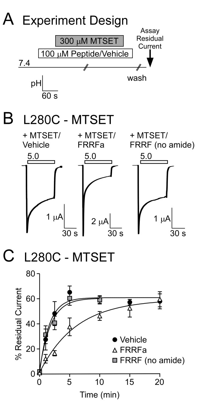 Figure 5. FRRFa impairs MTSET modification.A. Schematic of MTSET/peptide experimental design. 100 µM peptide or vehicle was applied for 1 minute before application of MTSET (in the presence of vehicle or peptide). Excess MTSET was removed by washing in peptide (or vehicle) containing solutions. Finally, peptide (or vehicle) was washed-out thoroughly and residual current was measured. B. Representative traces of L280C pH 5.0-evoked currents following 2.5 minutes of MTSET modification in the presence of vehicle, FRRFa, or FRRF (no amide). C. Quantification of residual current after exposure to MTSET in the presence of vehicle, 100 µM FRRFa, or 100 µM FRRF (no amide). Curves represent one-phase association exponential fits of the data points. FRRFa significantly altered MTSET modification (p < 0.001, 2-way ANOVA). No difference was observed between Vehicle and FRRF (no amide). Data are mean ± SEM, n = 3-22. |