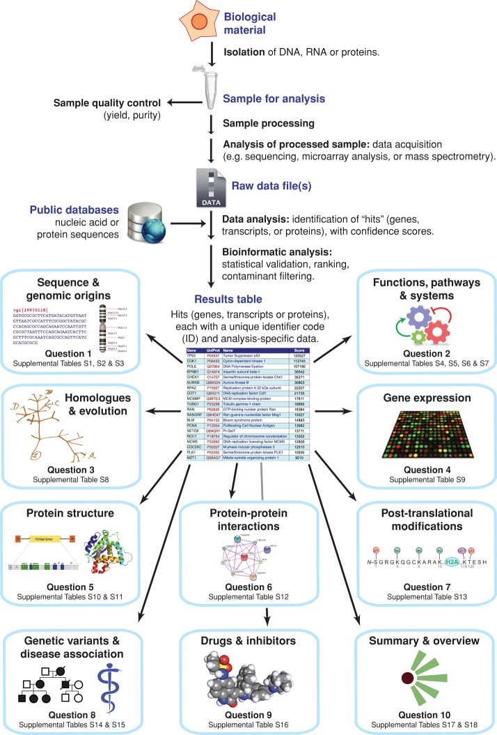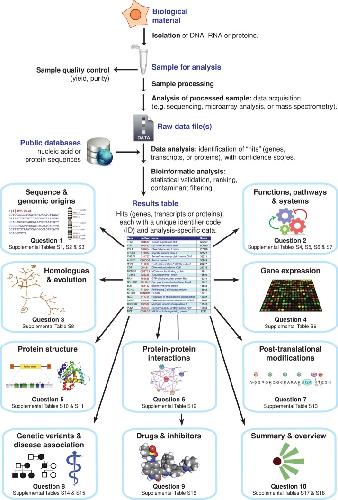 FIGURE 1:. Generalized workflow for the analysis of DNA, RNA, or protein samples and questions about the hits identified. Nucleic acid or protein samples isolated from the biological material of interest are processed, then analyzed by various methods. Raw analytical data are then matched to entries in public databases, generating a results table listing the genes, transcripts, or proteins (hits) identified. For each of these hits, 10 questions relating to their features, functions, and other properties are shown (blue boxes). Each question is addressed by a section in the text, plus one or more supplemental tables containing examples of hyperlinks to entries in online resources.