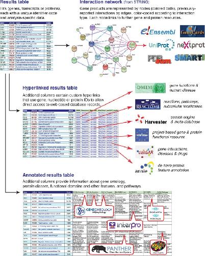 FIGURE 2:. Approaches for obtaining functional information about experimentally identified gene, transcript, or protein hits. Freely available software tools can be used to obtain information about features and functions of genes, transcripts, or proteins in a results table from multiple sources. Generation of an interaction network shows at a glance the nature of any previously reported interactions between members of a set of hits, each of which can be explored using the resources indicated. Making a hyperlinked results table allows one-click access from each hit directly to relevant pages from a wide range of resources. Creating an annotated results table containing controlled-vocabulary terms or keywords from a range of sources allows hits to be classified and sorted on the basis of these terms. Step-by-step protocols for performing these analyses are presented in the Supplemental Materials.