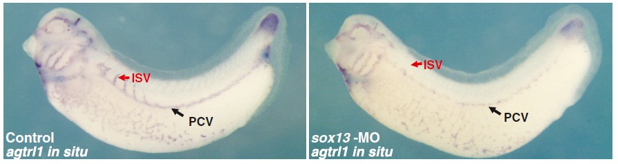 Fig. S5. Morpholino (MO) knockdown of sox13 induces defects in vasculature, measured using in situ hybridization versus an independent marker of the vasculature, the angiotensin receptor homolog agtrl1 (12 of 19 animals tested). Such defects are rare in untreated control animals (0 of 22 control animals