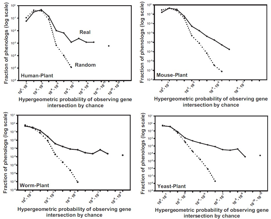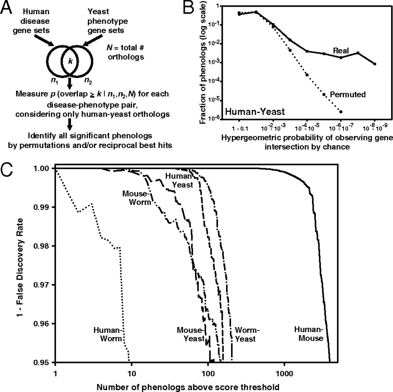 Fig. 2. Systematic identification of phenologs. (A) For a pair of organisms, sets of genes known to be associated with mutational phenotypes are assembled, considering only orthologous genes between the two organisms. Pairs of mutational phenotypes—one phenotype from each organism, each associated with a set of genes—are then compared to determine the extent of overlap of the associated gene sets, calculating the significance of overlap by the hypergeo-metric probability. Comparison of the distribution of observed probabilities with those derived from the same analysis following permutation of gene-phenotype associations reveals that many more orthologous phenotypes are observed than expected by random chance, as shown in B for the case of the human-yeast comparison (also Fig. S1), and summarized for each organism pair in C.
