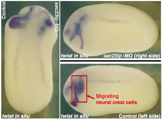 Fig. S7. Morpholino (MO) knockdown of sec23ip induces defects in neural crest cell migration, measured using in situ hybridization versus twist, an independent marker of the neural crest cells (8 of 14 animals tested). Such defects are rare in untreated control animals (0 of 14 control animals tested with twist).