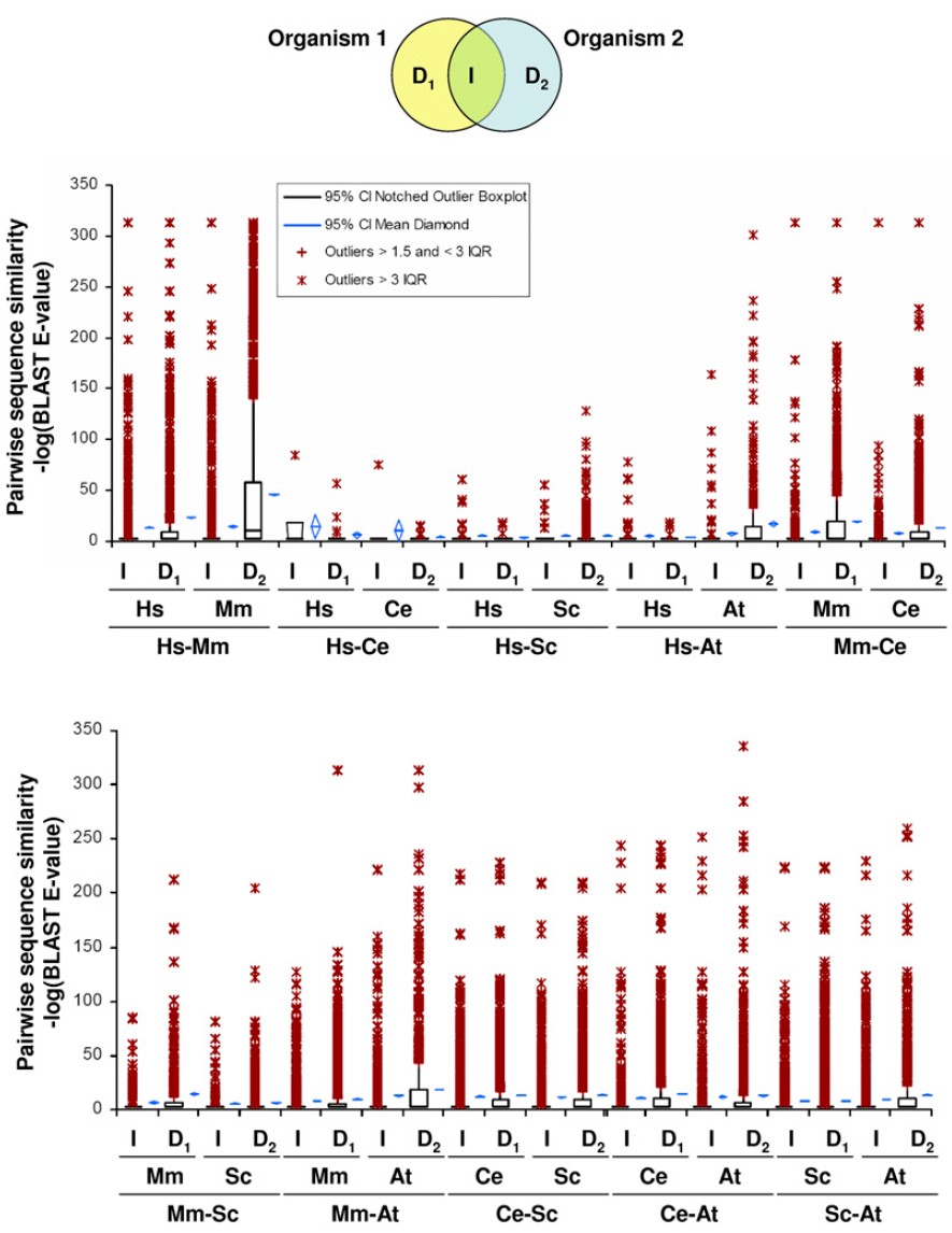 comparison), in 14 cases gene pairs in the I sets showed less significant BLAST E-values than those in the D sets (one-tailed P < 0.0001 for each; Wilcoxon-Mann-
