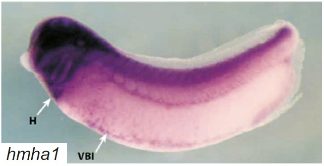 hmha1 (histocompatibility (minor) HA-1) gene expression in Xenopus laevis embryos, NF stage 32, as assayed by in situ hybridization. Lateral view: anterior left, dorsal up.