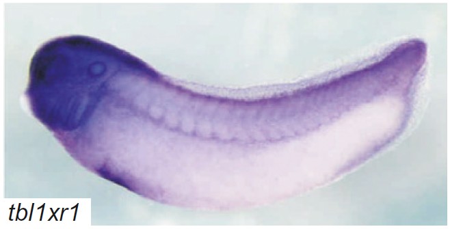 tbl1xr1 (transducin (beta)-like 1 X-linked receptor 1)gene expression in Xenopus laevis embryos, NF stage 32, as assayed by in situ hybridization, lateral view, anterior left, dorsal up.