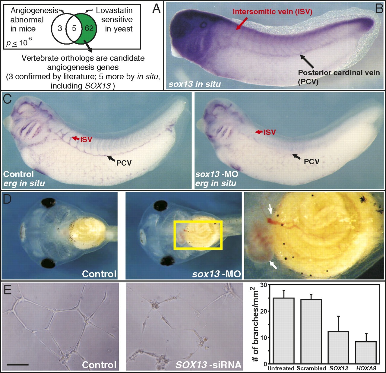Fig. 3. Example of a nonobvious disease model revealed by phenologs: a yeast model of angiogenesis. (A) The sets of 8 genes (considering only mouse/yeast orthologs) associated with mouse angiogenesis defects and 67 genes associated with yeast hypersensitivity to the hypercholesterolemia drug lovastatin significantly overlap, suggesting that the yeast gene set may predict angiogenesis genes. This prediction was verified in Xenopus embryos for eight genes (three from literature support and five based upon vascular expression patterns) (Fig. S3) and studied in detail for the case of the transcription factor sox13. (B) sox13 is expressed in developing Xenopus vasculature, as measured by in situ hybridization (also Fig. S4). (C) Morpholino (MO) knockdown of sox13 induces defects in vasculature, measured using in situ hybridization versus the vasculature markers erg (defects observed in 31 of 49 animals tested) or agtrl1 (12 of 19 animals tested) (Fig S5). Such defects are rare in untreated control animals and five base pair mismatch morpholino (MM) knockdowns (0 of 22 control animals tested with agtrl1, 2 of 46 tested with erg; 5 of 28 MM animals tested with erg). (D) Hemorrhaging (white arrows) is apparent in stage 45 Xenopus embryos because of dysfunctional vasculature following sox13 morpholino knockdown (12 of 50 animals tested; two also showed unusually small hearts with defective morphology; Right: magnification of yellow boxed region in Middle), but is rare in control animals (1 of 45 tested untreated animals, 1 of 22 sox13-MM knockdown animals tested). All phenotypes in Figs. 3 and 4 are significantly different from controls by Ï2 tests (P < 0.001). (E) In an in vitro human umbilical vein endothelial cell model of angiogenesis, knockdown of human SOX13 by siRNA disrupts tube formation (an in vitro model for capillary formation) to an extent comparable to knockdown of a known effector of angiogenesis (HOXA9) and significantly more than untreated cells or cells transfected with an off-target (scrambled) negative control siRNA. (Scale bar, 100 μm.)