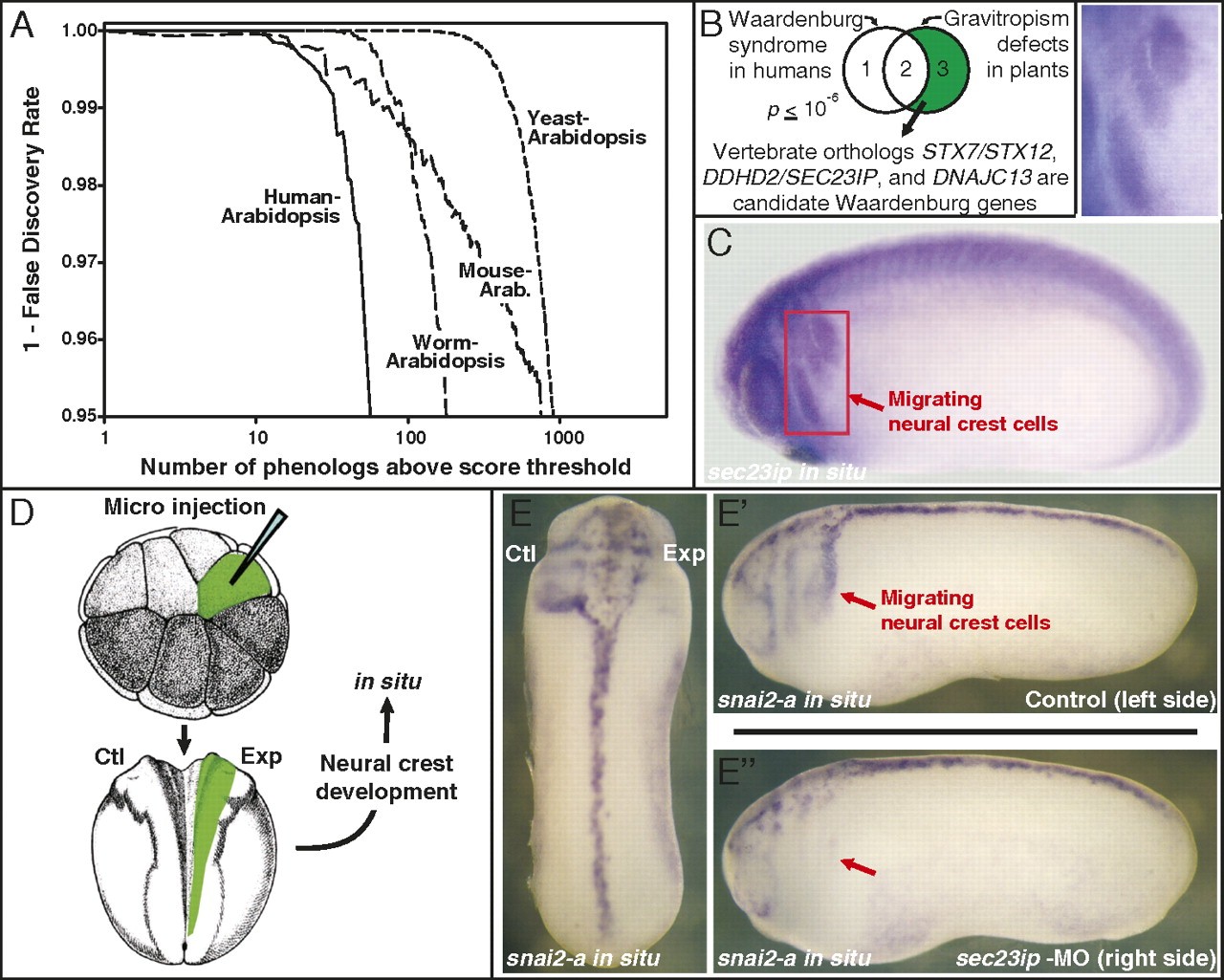 Fig. 4. Phenologs reveal plant models of human disease, including a model of Waardenburg syndrome (WS) neural crest defects. (A) Many orthologous phenotypes are observed between Arabidopsis and worms, yeast, mouse, and humans, with hundreds more than expected by chance. Many mammalian/plant phenologs relate to vertebrate developmental defects, including models for WS and other birth defects. (B) Considering only human/Arabidopsis orthologs, the three known WS genes significantly overlap the five genes associated with negative gravitropism defects in Arabidopsis. The plant gene set suggests unique candidate WS genes. (C) In situ hybridization versus candidate sec23ip in developing Xenopus embyros confirms neural crest cell expression. (D) Unilateral morpholino knockdown of sec23ip induces (E) defects in neural crest cell migration on the side with the knockdown (E'') but not the control side (E'), measured using in situ hybridization versus two independent markers of neural crest cells, snai2-a (defects observed in 23 of 35 animals tested) and twist (8 of 14 animals tested) (Fig S7). Such defects are rare in untreated control animals and off-target morpholino (OM) knockdowns (0 of 21 control animals tested with snai2-a; 1 of 14 OM animals tested with snai2-a; 0 of 14 OM animals tested with twist).