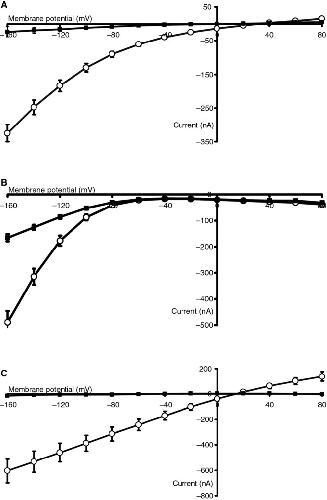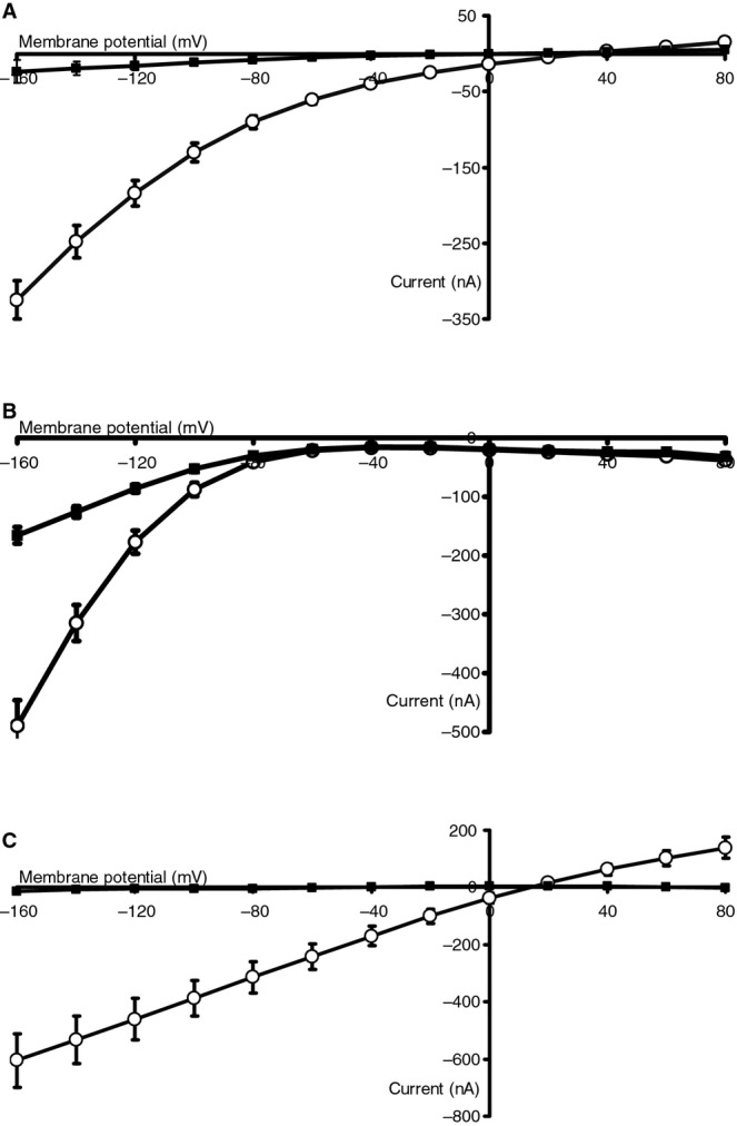 Figure 1. Current–voltage (I/V) relations induced by 1 mmol/L GQ (open circles) and by 1 mmol/L β‐AK‐AMCA (filled squares) in oocytes expressing (A) Caenorhabditis elegans PEPT1 (cePEPT1), (B) rabbit PEPT2 (rPEPT2), or (C) rabbit PEPT1 (rPEPT1). Please note the low, but significant transport current induced by β‐AK‐AMCA in cePEPT1, the higher current in rPEPT2 and the absence of β‐AK‐AMCA‐induced current in rPEPT1. Similar I/V relations have also been recorded in the other transporters listed in Table 1 (not shown).