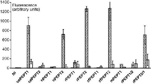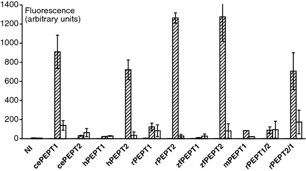 Figure 2. Fluorescence (arbitrary units) induced by 3 h incubation in solutions containing 1 mmol/L β‐AK‐AMCA without or with 20 mmol/L GQ in oocytes expressing Caenorhabditis elegans (ce), human (h), rabbit (r), zebrafish (zf), mouse (m) PEPT1 and PEPT2 transporters, and rabbit chimeric transporters. NI, non‐injected. Dark columns: without β‐AK‐AMCA; shaded columns: with 1 mmol/L β‐AK‐AMCA; open columns: with 1 mmol/L β‐AK‐AMCA + 20 mmol/L GQ. For details see Materials and Methods.