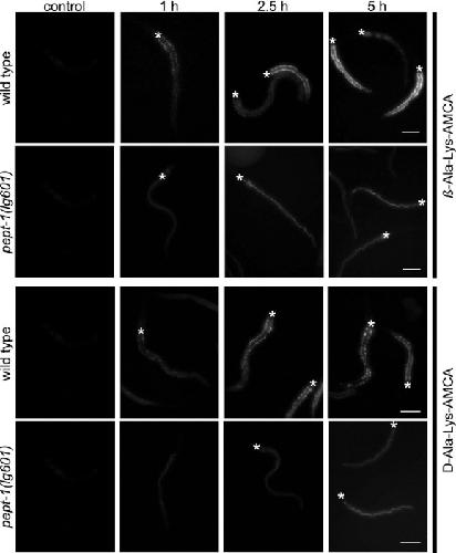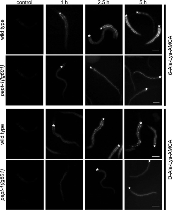 Figure 3. Time‐dependent uptake of β‐AK‐AMCA and d‐AK‐AMCA in wild type and peptide transporter deficient pept‐1(lg601) Caenorhabditis elegans. The animals were incubated for 10 min, 1 h, 2.5 h, and 5 h in medium containing 1 mmol/L β‐ or d‐AK‐AMCA and representative images are shown. The fluorescent signal is mostly detectable in the intestinal epithelial cells. The anterior end of the nematodes in the representative images is positioned to the top and the asterix mark the terminal bulb of the pharynx (*). Scale bars indicate 50 μm.