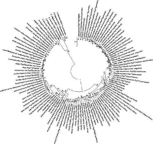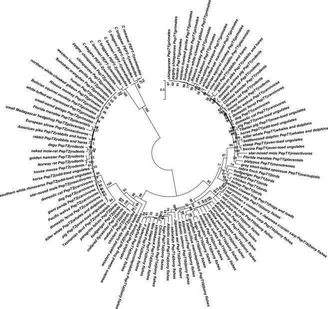 Figure 4. Molecular phylogenetic analysis performed on vertebrate PEPT1 and PEPT2 and nematode PEPT1 and PEPT2 by maximum likelihood (ML) method. The evolutionary history was inferred by using the ML method based on the Whelan and Goldman (2001) model. The tree with the highest log likelihood (−37,196.4871) is shown. Initial tree(s) for the heuristic search were obtained automatically as follows. When the number of common sites was <100 or less than one‐fourth of the total number of sites, the maximum parsimony method was used; otherwise BIONJ method with MCL distance matrix was used. A discrete Gamma distribution was used to model evolutionary rate differences among sites (five categories; +G, parameter = 0.9600). The rate variation model allowed for some sites to be evolutionarily invariable ([+I], 9.1163% sites). The tree is drawn to scale, with branch lengths measured in the number of substitutions per site. The analysis involved 114 amino acid sequences. All positions with less than 95% site coverage were eliminated. That is, fewer than 5% alignment gaps, missing data, and ambiguous bases were allowed at any position. There were a total of 630 positions in the final data set. Evolutionary analyses were conducted in MEGA5 (Tamura et al. 2011).