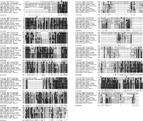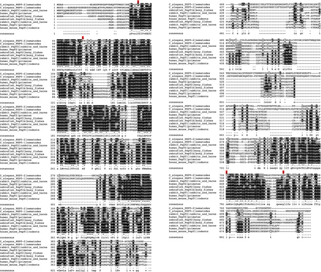 Figure 5. Sequence comparison performed on rabbit, human, mouse and zebrafish PEPT1, rabbit, human and zebrafish PEPT2, Caenorhabditis elegans PEPT1, and C. elegans PEPT2 amino acid sequences. Multiple sequence alignment was obtained by Clustal Omega (1.2.0) using default parameters. Consensus is reported. Candidate amino acid substitutions along the sequence are indicated with an arrow highlighted in red.