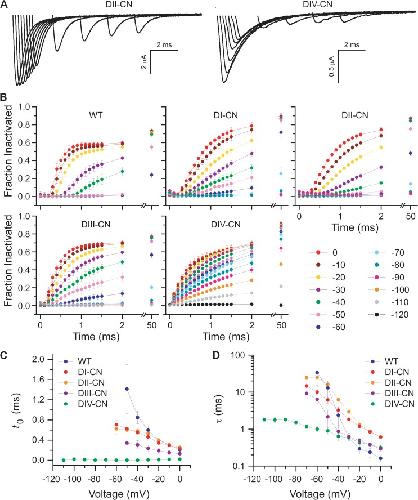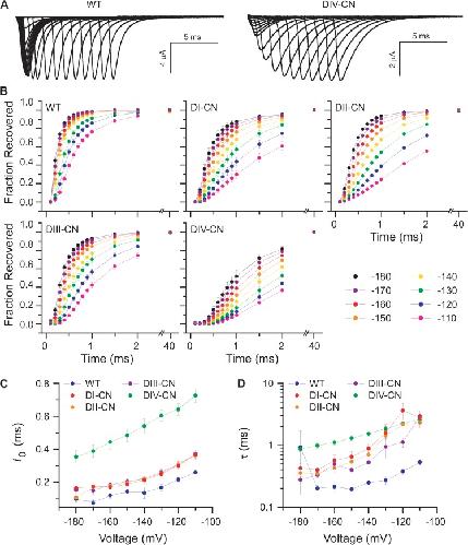 Figure 2. DIV voltage-sensor movement is sufficient for fast inactivation. (A) A representative family of current traces in response to a 30-ms test pulse to −30 mV to assay the fraction of non–steady-state inactivated channels after a 100-ms conditioning prepulse between −170 and 50 mV. See Results for a detailed description of the voltage-pulse protocol. (B) Normalized steady-state inactivation versus conditioning prepulse voltage for wild-type and mutant channels. Solid lines are single Boltzmann fits to the mean for each construct (wild type: V1/2 = −62.3 mV and z = 4.7 e−; DI-CN: V1/2 = −69.2 mV and z = 4.2 e−; DII-CN: V1/2 = −65.8 mV and z = 3.7 e−; DIII-CN: V1/2 = −68.7 mV and z = 2.7 e−; DIV-CN: V1/2 = −137.3 mV and z = 1.1 e−). Note that the relation does not saturate above −200 mV for DIV-CN, so the observed left-shift in the steady-state inactivation versus voltage relation reflects the minimum shift conferred by this mutant.