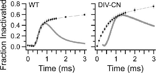 Figure 7. DIV voltage-sensor movement as a mechanism for fast inactivation from closed states. Representative current traces for wild-type and DIV-CN channels in response to a depolarization to −20 mV as shown in Fig. 1 B overlaid with their respective time courses for development of fast inactivation at −20 mV as shown in Fig. 3 B. Currents were scaled to the fraction of fast inactivated channels at the time of peak current. Development of fast inactivation precedes current rise for DIV-CN but not wild-type channels.