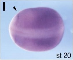 sostdc1 expression (sclerostin domain containing 1) assayed through in situ hybridization Xenopus laevis embryo, NF stage 20, dorsal view, anterior to the left.