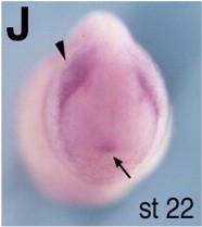 sostdc1 expression (sclerostin domain containing 1) assayed through in situ hybridization Xenopus laevis embryo, NF stage 22, anterior view, dorsal up.