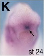sostdc1 expression (sclerostin domain containing 1) assayed through in situ hybridization Xenopus laevis embryo, NF stage 24, anterior view, dorsal up.