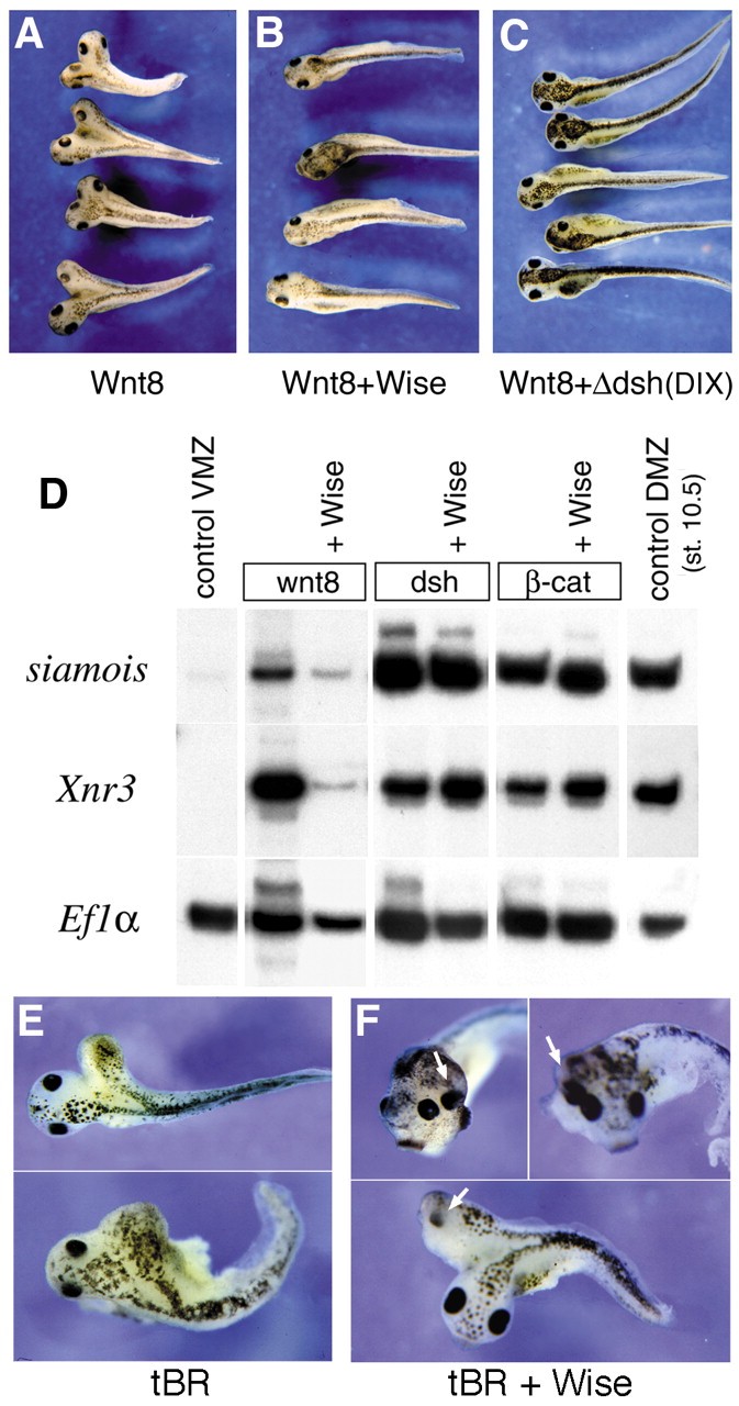 Fig. 6. Wise interferes with Wnt signalling. (A-C) Wise blocks secondary axes induced by Wnt8. Injection of Wnt8 RNA into a ventral vegetal blastomere of four- to eight-cell stage embryos induces complete secondary axis formation (A). Co-injection of Wise blocks formation of Wnt8-induced secondary axes (B), as does co-injection of a dominant-negative dishevelled, δDsh (DIX) (C). (D) Wise functions extracellularly to block induction of siamois and Xnr3 by the Wnt pathway in ventral marginal zone (VMZ) explants. Wise blocks the ability of Wnt8 to induce siamois and Xnr3, but does not interfere with the ability of dishevelled (dsh) or β-catenin (β-cat) to induce these markers. DMZ, dorsal marginal zone explant. (E,F) Wise acts as a Wnt inhibitor and complements a truncated BMP receptor (tBR) to induce head structures. When BMP signalling is blocked in the ventral marginal zone by injection of tBR, an incomplete secondary axis is formed (E). Co-injection of tBR and Wise induces a complete secondary axis with eyes (arrows) and cement gland (F).