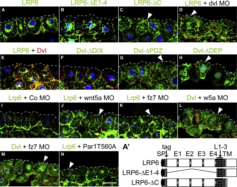 (AâN) Confocal immunofluorescence microscopy of tagged (AâH, L, and M) or endogenous (IâK and N) proteins in blastulae. Embryos were injected with tagged LRP6, Dvl, or Par1T560A mRNAs and Morpholino oligonucleotides (MO) as indicated. Unless the color code is indicated, b1-integrin delineates the basolateral membrane in red. Dashed lines, apical membrane; arrowheads, cells with symmetric protein localization in green channel. Scale bar applies to all panels and represents 30 mm. (A0 ) LRP6 deletion constructs scheme. Experiments were typically carried out independently at least three times with similar results. For each experiment, more than ten embryos per sample were analyzed.