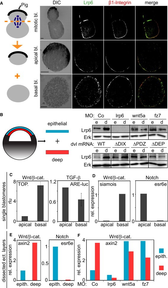 (A) Scheme and immunofluorescence confocal microscopy of isolated single outer blastomere from the animal region of a 64-cell embryo. Endogenous Lrp6 and b1-integrin were stained as indicated. Scale bar represents 50 mm; pig, pigment. See also Figure S3.