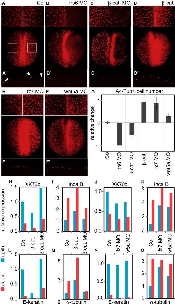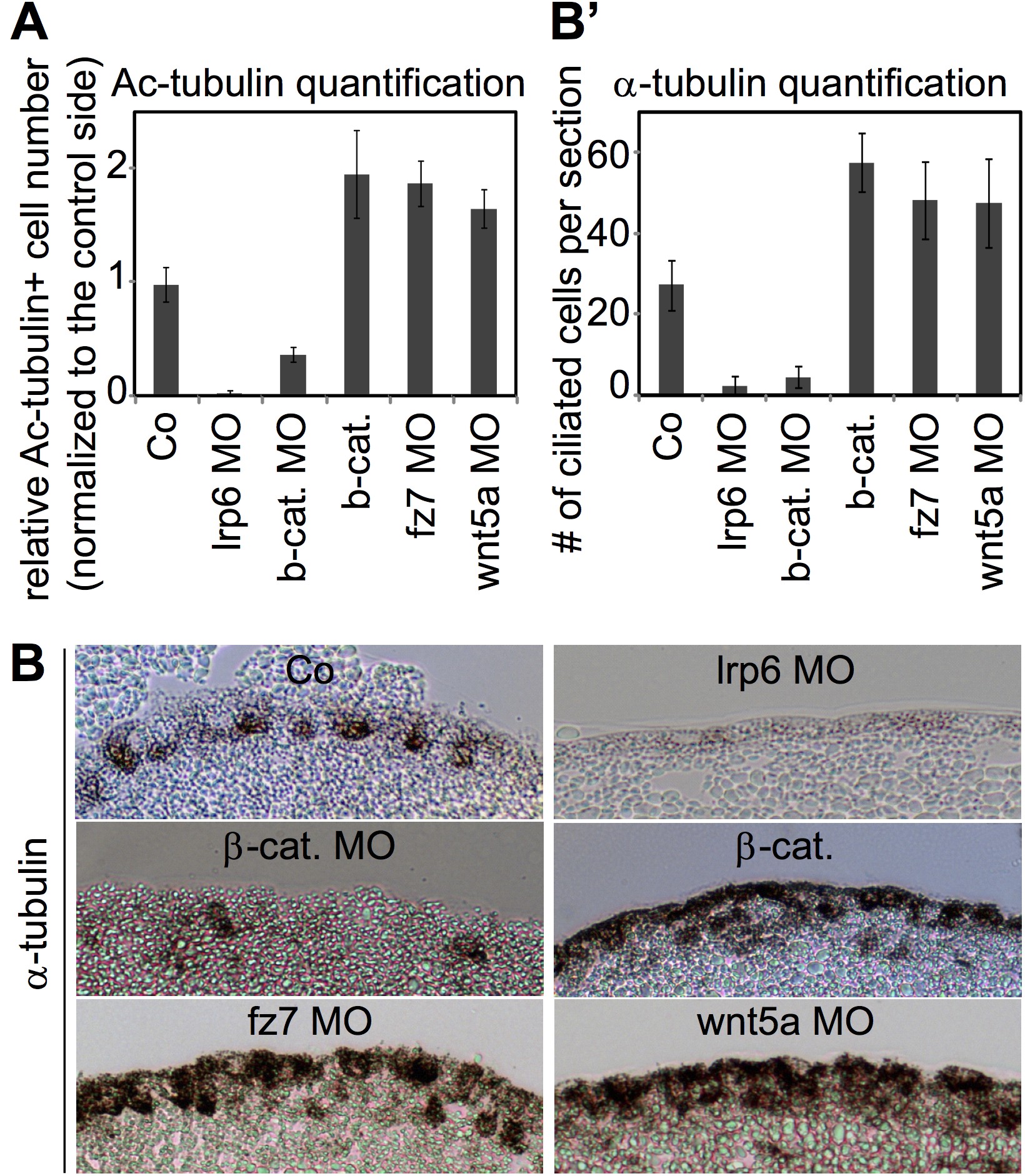 (A) quantification of Figure 4Aâ-Fâ showing relative Ac-tubulin positive cell number per embryo section. n>10 embryos per condition and >200 Ac- tubulin positive cells for each uninjected embryo side. Error bars, s. d. (B) α-tubulin in situ hybridization followed by cryo section in neurulae. (Bâ) quantification of (B). For each bar, n=10.