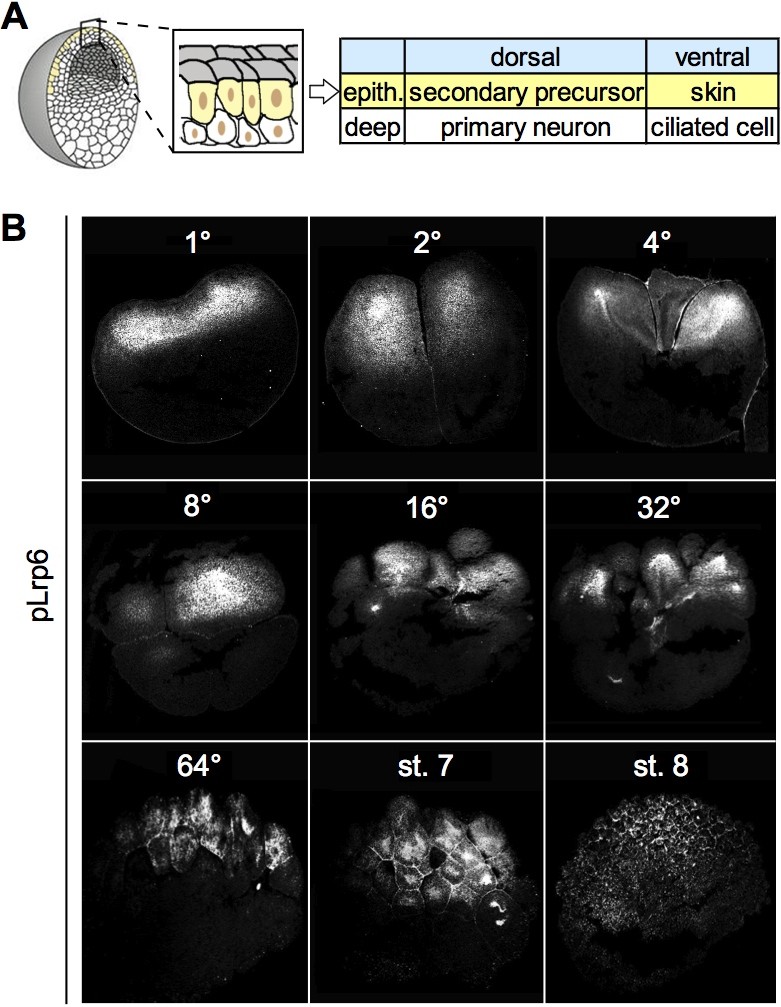 (A) Scheme showing cell fates of Xenopus blastula/gastrula ectodermal cells. The outer ectodermal layer consists of epithelial cells (yellow), which are apico- basally polarized. The inner layer consists of deep cells which are unpolarized. On the dorsal side the epithelial cells give rise to secondary neuronal precursors and the deep cells to primary neurons. On the ventral side the epithelial cells give rise to goblet cells and the deep cells to multiciliated cells. The midblastula stage is shown in section to reveal the blastocoel. (Modified from K. Kalthoff, Analysis of Biological Development, 2d ed., McGraw-Hill, 2001)