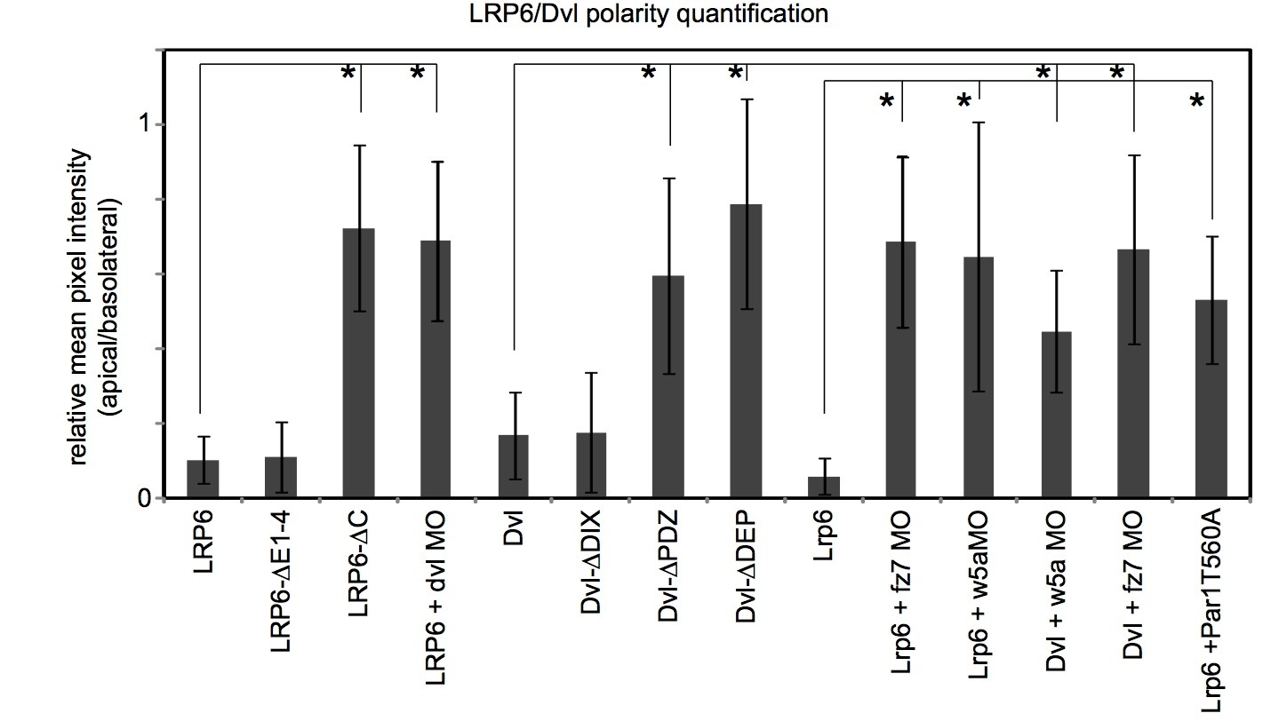 Mean pixel intensity of apical or basolateral membrane of epithelial ectodermal cells was measured by ImageJ. For each bar, n=50 cells (more than 10 embryos) analyzed; *, p<0.001