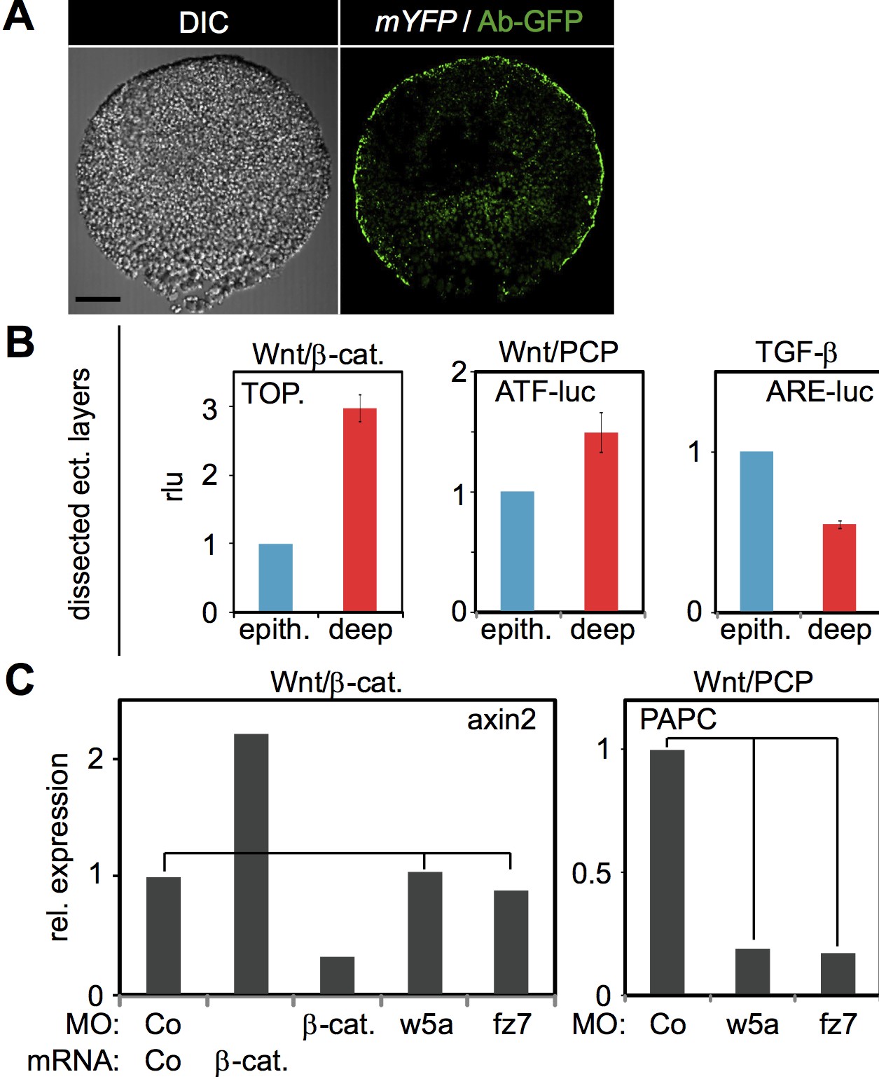 (B) Dissected ectodermal layers from embryos injected with different reporter plasmids showed significantly higher activity of Wnt/β-catenin signaling and slightly higher activity of Wnt/PCP signaling in the deep cell layers. An Activin (TGF-β) reporter showed preferentially epithelial, albeit weak luciferase activity. For each bar, three pools of fifteen epithelial/deep layers were analyzed.