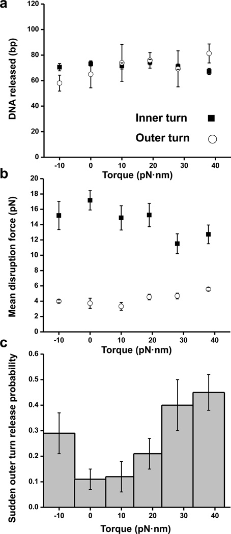 Fig. 2. Characterizing nucleosome disruption under force and torque(a) Sudden release of the inner (filled squares) and outer (open circles) turns of DNA in a nucleosome. Error bars are SEM. (b) Mean disruption forces of the inner (filled squares) and outer (open circles) turns of DNA in a nucleosome. Error bars are SEM. Between 25 and 64replicates have been obtained for each torque (Table 1).(c) Fraction of traces that displayed a sudden outer turn release as a function of torque. Error bars are standard errors of the binomial distribution (see Methods).