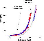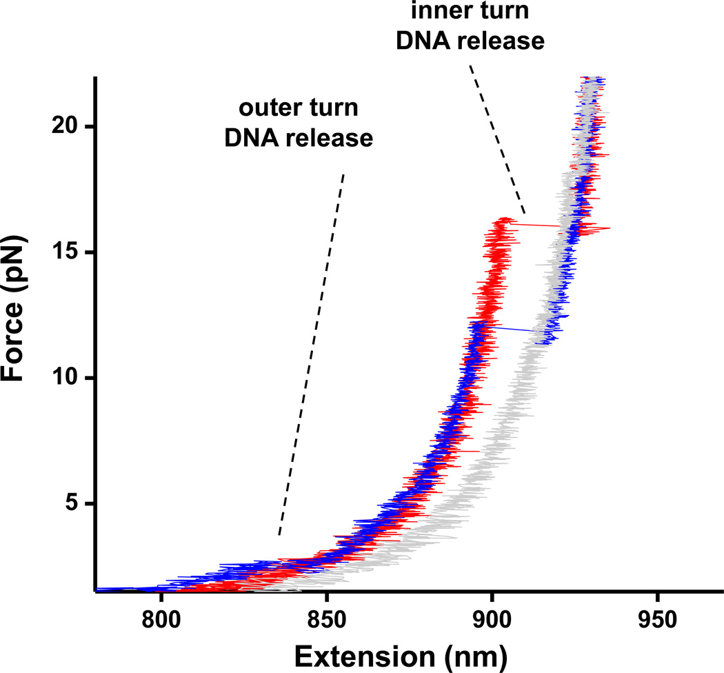 Fig. 3. Tetrasome force-extension curvesNaked DNA (grey), recombinant tetrasome (red), recombinant nucleosome with a sudden lower force disruption (blue), all stretched under no torsion.