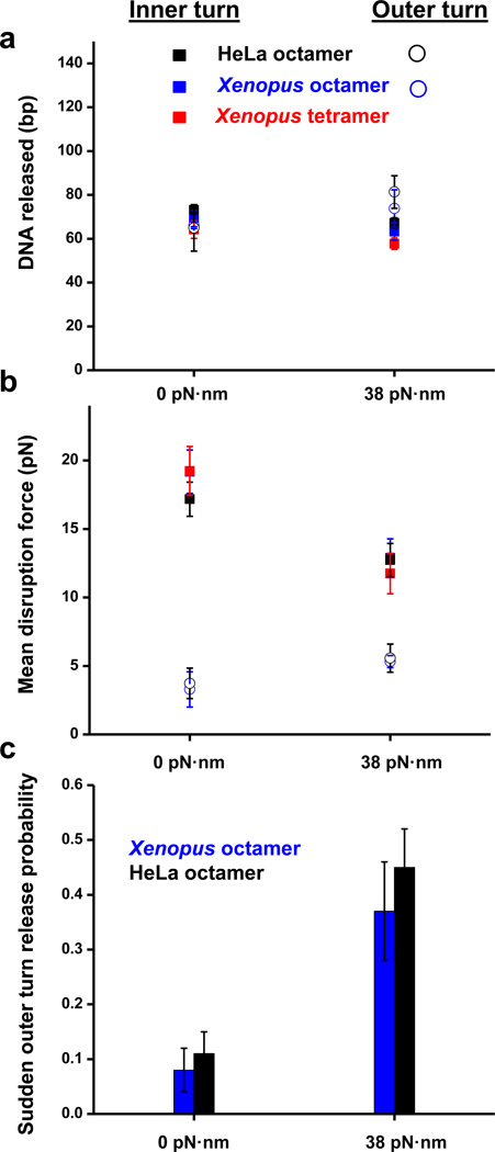 Fig. 4. Characterizing tetrasome disruption under force and torque(a) Sudden release of the inner (filled squares) and outer (open circles) turns of DNA in a tetrasome and a nucleosome. Error bars are SEM. (b) Mean disruption forces of the inner (filled squares) and outer (open circles) turns of DNA in a tetrasome and a nucleosome. Error bars are SEM. Between 15 and 37replicates have been obtained for each torque (Table 1).(c) Fraction of traces that displayed a sudden outer turn release as a function of torque. Red color refers to Xenopus recombinant tetrasome, blue - Xenopus recombinant nucleosome, black – HeLa purified nucleosome. Error bars are standard errors of the binomial distribution (see Methods).