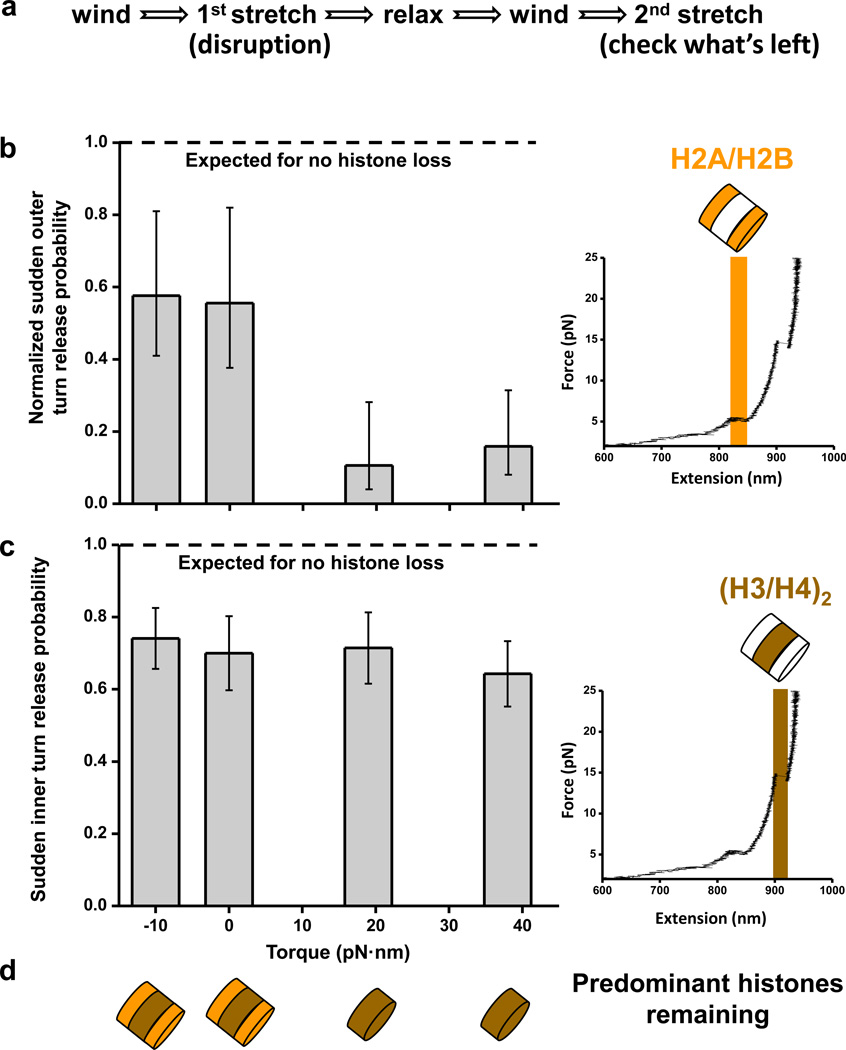Fig. 5. Histone fate upon disruption under torque(a) Experimental strategy to examine the nucleosome stability under torque. A nucleosomal DNA molecule was supercoiled to a desired torsion, stretched at 2 pN/s from 1 pNup to 30 pNof force to disrupt the nucleosome before being relaxed over 1 s to 0.7 pN. It was then wound to +38 pN·nmand stretched again to determine which histones remained on the DNA. The time between relaxation and the second stretching was always kept at 30 s. (b) The probability of observing a sudden disruption at low force during the second stretch (right inset) was normalized to the corresponding value of the control stretch at +38 pN·nm of torque. Normalized probability of observing a sudden low force disruption is equivalent to the probability of retaining H2A/H2B after the initial stretch. Between 21 and 28replicates have been obtained for each torque value (Table 1). Error bars are standard errors of the ratio of two binomial distributions (see Methods).(c) The probability of observing a sudden high force disruption (right inset) signifies the probability of retaining (H3/H4)2 after the initial stretch. Between 21 and 28replicates have been obtained for each torque (Table 1) Insets show a representative trace of the force-extension curve resulting from a second stretch. Error bars are standard errors of the binomial distribution (see Methods).(d) Cartoons of predominant histones remaining on the DNA after disruption.