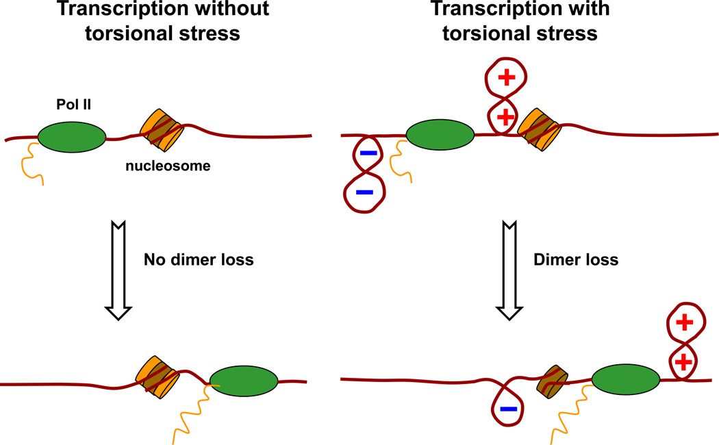 Fig. 6. A cartoon illustrating RNA polymerase II elongation through chromatin. During transcription under low torsion, nucleosomes remain largely intact after transcription. In contrast, during transcription under high torsion, significant dimer loss occurs in nucleosome after transcription. (H3/H4)2 tetramer is shown in brown, and H2A/H2B dimer in orange.