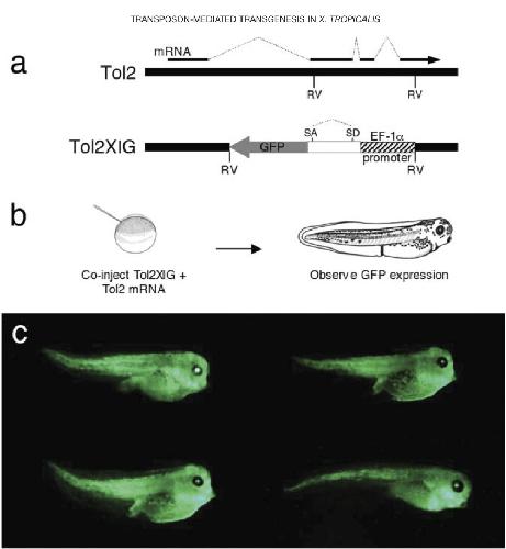 FIG. 1. Tol2 transgenesis in Xenopus tropicalis. (a) Schematic of the Tol2 transposon (Tol2) and the modified non-autonomous substrate (Tol2XIG) that was used in this study (not to scale) (Kawakami and Shima, 1999). The Xenopus EF-1a promoter drives expression of GFP. The mini-gene is cloned in the antisense orientation relative to the Tol2 sequence. An intron is included upstream of the reporter to promote correct processing of the transcript. SA, splice acceptor; SD, splice donor. (b) Schematic of the microinjection procedure and subsequent screening. (c) Representative examples of GFP-positive tadpoles after injection of Tol2 plasmid DNA and Tol2 mRNA at the one cell stage. Reproduced with permission of the Publisher, John Wiley & Sons.
