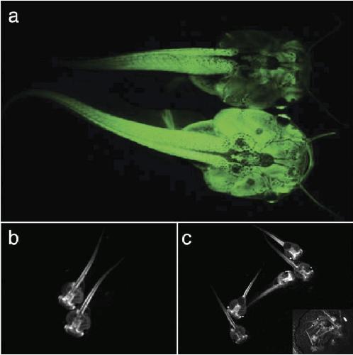 FIG. 2. Germline transmission of Tol2 transposon transgenes. (a) Stage 50 sibling GFP-positive F1 tadpoles from founder 12M. Note the difference in intensity of GFP expression likely reflects either transposon integration position effects or the number of independently segre- gating alleles present in each individual (see text and Southern analysis in Fig. 3b). (b) Stage 40 GFP-positive F1 tadpoles from founder 10M. (c) Stage 40 GFP-positive and GFP-negative F2 tadpoles generated by outcross of 10M F1 adults. Insert shows bright-field photo- micrograph of the same group of tadpoles and reveals the GFP-negative siblings. Reproduced with permission of the Publisher, John Wiley & Sons.