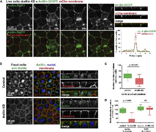 Anillin regulates cell-cell junction integrity by organizing junctional accumulation of Rho-GTP and actomyosin.