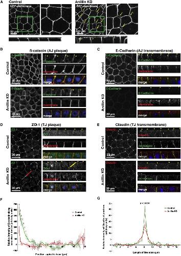 Figure 2. AJs and TJs Are Disrupted when Anillin Is Knocked Down (A) Single intermediate plane views (top) and z views (bottom) of GFP-membrane in control and Anillin KD embryos reveal increased intercellular spaces in Anillin KD embryos (yellow arrows and arrowheads). (BâE) Fixed staining of control and Anillin KD embryos for β-catenin (B), E-Cadherin (C), ZO-1 (D), and Claudin (E). GFP-membrane or mChe-membrane was used as a MO injection marker, and DAPI labels DNA. z views show the normal localization of the cell-cell junction proteins in control cells as well as the disrupted localization in Anillin KD cells (see yellow arrowheads). The x-y TJ protein images on the left in (D) and (E) are maximal-intensity projections of serial z sections. The red arrow in (D) highlights an intercellular space between a dividing cell and its neighbor, whereas the yellow arrow indicates a ZO-1 concentration that is buried basally. (F) Quantification of β-catenin polarization in control and Anillin KD cells from line scans along the basolateral surface. The β-catenin signal at the ten most-basal points was normalized to zero so that data from multiple embryos could be averaged (see Supplemental Experimental Procedures for details). Data are from two independent experiments; n = 26 embryos for control and n = 18 embryos for Anillin KD, graphed as mean ± SEM; âp ⤠0.05, ââp ⤠0.01, âââp ⤠0.001. (G) Quantification of the relative intensity of Claudin at cell-cell junctions by generating line scans perpendicular to junctions (see Supplemental Experimental Procedures for details). Data are from two independent experiments; n = 10 embryos for control and n = 12 for Anillin KD, graphed as mean ± SEM; p < 0.0001. See also Figure S2. |