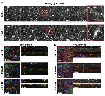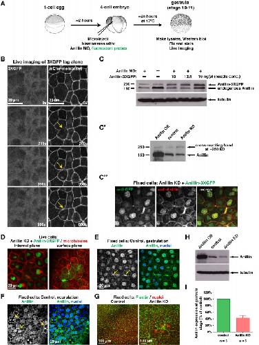 Figure S1. Anillin localizes at cell-cell junctions in interphase and mitotic epithelial cells, and Anillin protein levels are knocked down by the Anillin MO, Related to Figure 1. A. Cartoon of injection scheme and timing. Xenopus embryos were injected at the 2-cell or 4-cell stage with the Anillin MO and/or mRNAs for fluorescent probes. Embryos were used for live imaging, fixation, or lysates at gastrulation (stage 10-11) for all experiments unless otherwise indicated. B. Live co-imaging of 3XGFP alone (left) and mChe-membrane (right). Images are brightest point projections of 14 apical z planes. The 3XGFP tag alone exhibits nonspecific cytoplasmic localization. C. Western blot showing KD of endogenous Anillin and expression levels for three replacement concentrations of Anillin-3XGFP. Bottom panel shows the same blot stripped and re-probed for tubulin as a loading control. C’. Western blot showing that a cross-reactive band of the same size as Anillin-3XGFP is present in embryos that were not injected with Anillin-3XGFP. C”. Cells were injected with the Anillin MO and Anillin-3XGFP then fixed and stained with anti-GFP (mouse, green) and anti-Anillin (rabbit, red) antibodies. The population of Anillin detected by each antibody is overlapping and highlights Anillin’s localization to the contractile ring, nuclei, and cell-cell junctions. D. Internal and surface views of epithelial cells in a gastrula stage Xenopus embryo injected with Anillin MO, Anillin-3XGFP (green), and 2XmChe-EMTB (red) to visualize microtubules. E. Control gastrula stage embryos were fixed and stained with anti-Anillin antibodies for endogenous Anillin (green) and with DAPI (blue). Endogenous Anillin is localized at the cell-cell junctions, nuclei, and contractile rings of dividing cells (yellow arrows). F. Same as Figure S1E but embryos were fixed at neurulation (stage 14). Endogenous Anillin strongly accumulates at the cell-cell junctions of dividing cells (marked by yellow arrows). G. Control and Anillin KD gastrula stage embryos were fixed and stained for F-actin (phalloidin, green) and nuclei (DAPI, pseudocolored red). Anillin KD embryos exhibit large, multinucleate cells, which result from cytokinesis failure. H. Western blot showing Anillin protein levels when Anillin was OE or KD as compared to control embryos. Xenopus embryo lysates were collected at gastrulation (stage 10- 11). The top panel shows the immunoblot probed with an anti-Anillin antibody, and the bottom panel shows the immunoblot probed with an anti-α-tubulin antibody as a loading control. I. Quantification of average Anillin KD efficiency expressed as a percentage of control levels. Control levels were normalized to 100%, and results from five independent experiments were averaged and graphed as mean + SEM. See also Movie S2. |