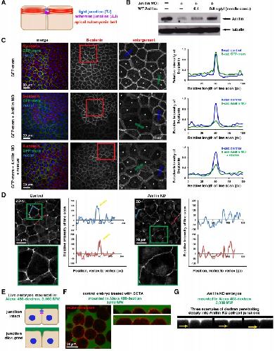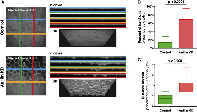 Figure 3. Junctional Integrity Is Compromised when Anillin Is Knocked Down (A) Live control or Anillin KD embryos were mounted in 3,000 molecular weight (MW) Alexa 488-Dextran. Left: x-y views show that dextran can penetrate between rounded cells in Anillin KD embryos. Right: z views generated along the indicated lines (top) and 3D views (bottom) show that, although dextran remains at the surface in control embryos, it can penetrate between cells in Anillin KD embryos. (B) Quantification of the average percentage of junctions where dextran penetrated into the intercellular space in control and Anillin KD embryos. Data are from three independent experiments; n = 13 embryos for controls and n = 17 embryos for Anillin KD, graphed as mean + SEM; p < 0.0001. (C) Quantification of the average depth of dextran penetration for control and Anillin KD embryos. Data are from three independent experiments; n = 13 embryos for controls and n = 17 embryos for Anillin KD, graphed as box-and-whisker plot with the whiskers representing the 1stâ99th percentile; p < 0.0001. See also Figure S2. |