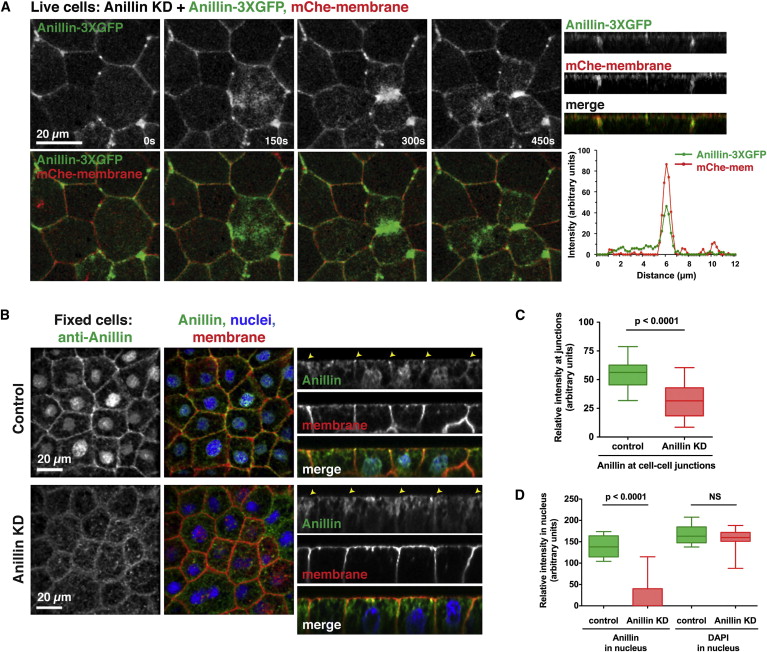 Figure 1. Anillin Localizes at Cell-Cell Junctions in Interphase and Mitotic Epithelial Cells (A) Live imaging of Anillin-3XGFP in gastrula-stage embryos in which endogenous Anillin was depleted. mChe-membrane labels the plasma membrane. Images are brightest point projections of 17 apical z planes. Nuclear Anillin is not visible because only apical planes were captured. Right: z view shows that Anillin-3XGFP is apically focused. Graph shows an average of five line scans drawn perpendicular to junctions, indicating that the peak intensities of Anillin-3XGFP and mChe-membrane overlap. (B) Embryos were injected with a GFP-membrane injection marker with or without the Anillin MO. Gastrula-stage embryos were fixed and stained with an anti-Anillin antibody (pseudocolored green), anti-GFP to view the membrane (pseudocolored red), and DAPI (blue). z views show that apically focused Anillin accumulation at cell-cell junctions is reduced when Anillin is depleted (yellow arrowheads). (C) Quantification of the average intensity of endogenous Anillin at cell-cell junctions in control and Anillin KD cells (see Supplemental Experimental Procedures for details). Data are from three separate experiments; n = 18 embryos for control and n = 19 embryos for Anillin KD, graphed as box-and-whisker plot with the whiskers representing the 1stâ99th percentile; p < 0.0001. (D) Quantification of the average endogenous Anillin and DAPI intensity in the nucleus in control and Anillin KD cells (see Supplemental Experimental Procedures for details). Data are from three independent experiments; n = 18 embryos for control and n = 19 embryos for Anillin KD, graphed as box-and-whisker plot with the whiskers representing the 1stâ99th percentile; p < 0.0001 for control versus Anillin KD for nuclear Anillin signal; p = 0.16 for control versus Anillin KD for DAPI signal. See also Figure S1 and Movies S1 and S2. |