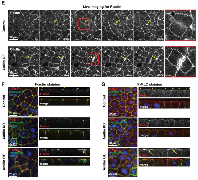 Figure S3. Anillin regulates the distribution of Rho-GTP, F-actin, and P-MLC. E. E. Frames from live confocal movies of F-actin in control and Anillin OE embryos. Embryos were injected with 20 ng/µl Anillin mRNA and imaged by live confocal microscopy at late blastula (stage 9). Embryos were co-injected with a probe for F-actin (mChe-UtrCH). Yellow arrows highlight dividing cells, and the red-boxed regions are enlarged on the right. When Anillin is OE, the F-actin in the contractile ring is intense and spiky, and the cells divide more slowly. F. (Left) merged images that correspond to those in Figure 4F of F-actin (red), GFPmem (green), and nuclei (blue) for control, Anillin KD, and Anillin OE embryos. For OE, embryos were injected with 40 ng/µl Anillin mRNA. (Right) z views of F-actin staining for control, Anillin KD, and Anillin OE embryos. F-actin is concentrated at the apical surface of each junction in controls (yellow arrowheads). However, F-actin accumulation is reduced in apically domed Anillin KD cells. In Anillin OE embryos, F-actin is more strongly accumulated at junctions and the apical cell cortex (yellow arrow) compared with controls. G. (Left) merged images that correspond to those in Figure 4G of P-MLC (red), GFPmem (green), and nuclei (blue) for control, Anillin KD, and Anillin OE embryos. For OE, embryos were injected with 40 ng/µl Anillin mRNA. (Right) z views of P-MLC for control, Anillin KD, and Anillin OE embryos. P-MLC is accumulated at the apical surface of each junction in controls (yellow arrowheads). However, P-MLC accumulation is reduced or lacking in Anillin KD cells. The remaining P-MLC signal in Anillin KD cells often is more broadly distributed compared with the focused apical signal in controls. In Anillin OE embryos, P-MLC is more strongly accumulated at junctions and the apical cell cortex (yellow arrows) compared with controls, and the apical cell surface is sometimes contracted (left yellow arrow). See also Movies S3-S5. |